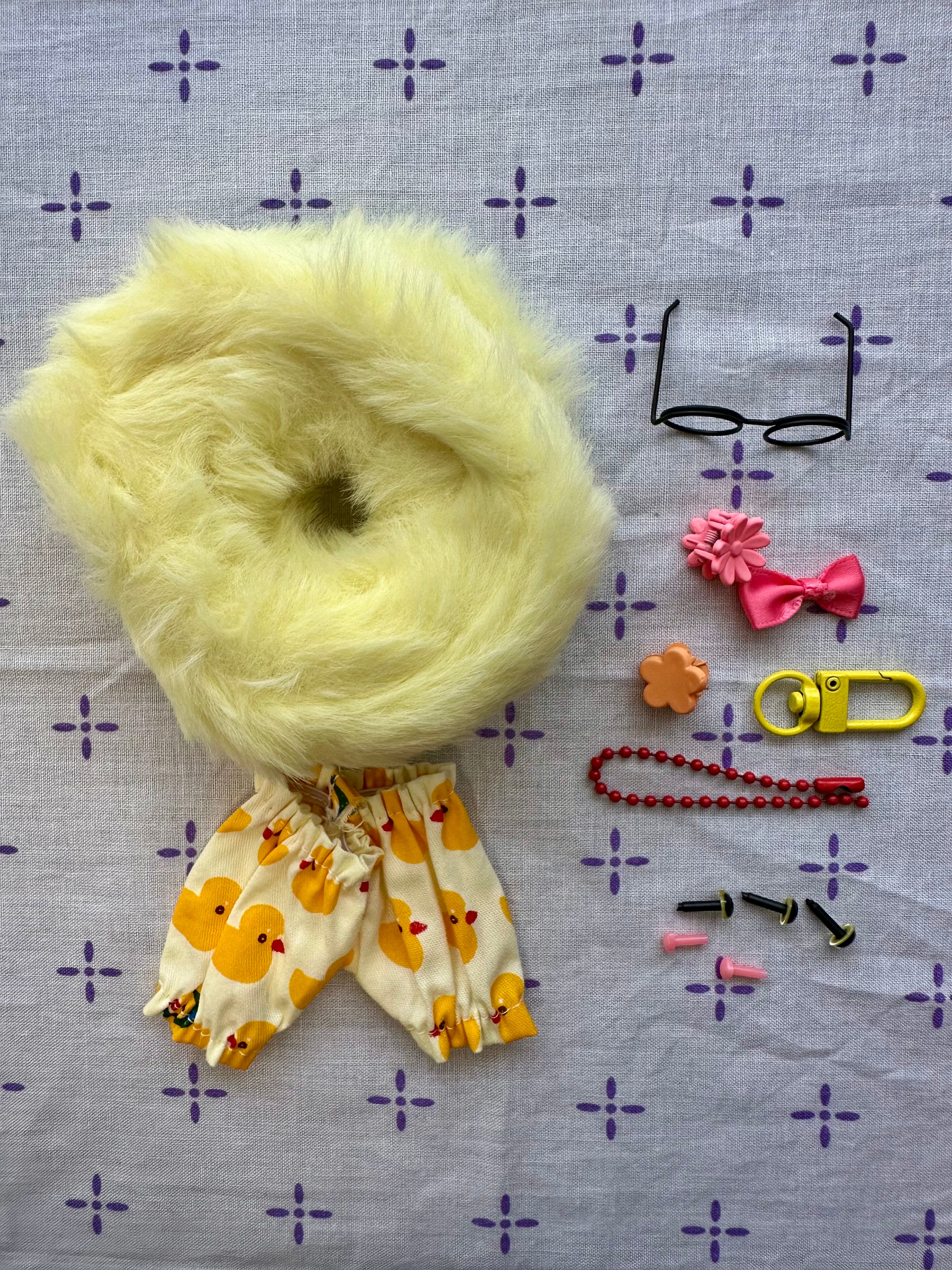 もふもふの手ざわりのミンク調モール(1m)1本に、コーディネートしたブルマー1点、リボン1点、めがね1点、飾りのクリップ2点、目(予備含む)3つ、鼻(予備含む)2つが含まれています。